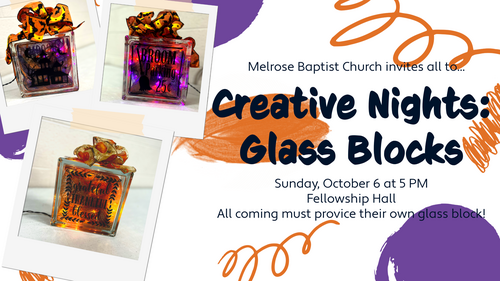 We will be holding our next Creatives Night on Sun., Oct. 5 at 5 PM in the Fellowship Hall. During the evening Kelda Flinchum will be walking us through customizing glass blocks using vinyl decals, ribbons, and lights. We are asking those that are planning to participate to please provide their own glass block by either: