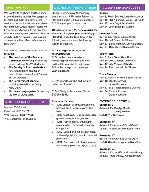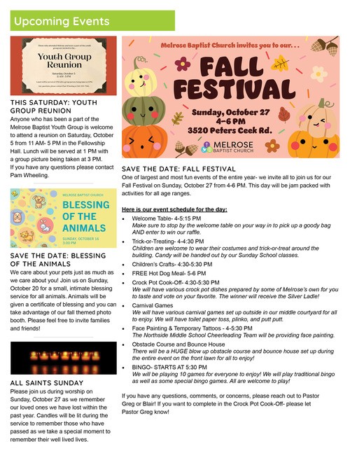 Bulletin for Sunday, October 5- World Communion SundayBulletin for Sunday, October 12, 2025Bulletin for Sunday, October 19, 2025October Business Meeting HighlightsBulletin for Sunday, October 26, 2025- All Saints SundayThe Messenger: November 2025Bulletin for Sunday, November 2, 2025- Communion Sunday