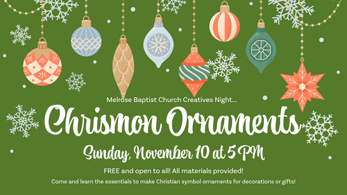 We invite all to come and join us on Sunday, November 10 at 5 PM to learn the essentials to making Chrismon ornaments. Chrismons are ornaments made during Advent that are symbolic of the name, life, and saving acts of Jesus Christ. You will have the choice of either making cross stitched or beaded ornaments. Instruction will be given for both ways and ALL supplies will be provided. Also, if you have a full tree but still want to learn how to make these ornaments, come and join us and donate your creation to the church to use on our Chrismon tree in the Sanctuary! Registration is not needed and this event is FREE!