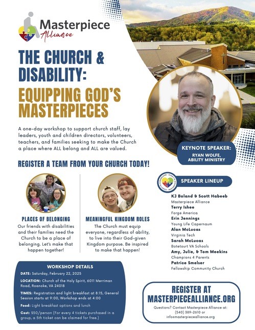 - Masterpiece Alliance is hosting a one day workshop on Saturday, Feb. 22 on “The Church and Disability”. If you are interested in going, please go to their website HERE to learn more and register.