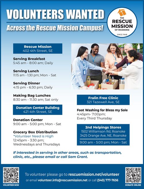 The Rescue Mission of the Roanoke Valley is in need of volunteers for all of their ministries including serving meals, grocery box distribution, and the Fralin free clinic. To inquire about volunteering please reach out directly to the Rescue Mission at rescuemission.net/volunteer, volunteer.info@rescuemission.net, or by calling 540-777-7656.