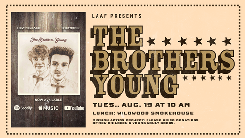 All those 50 and older are invited to this month's LAAF gathering on Tuesday, August 19 at 10 AM. This month's program is a special musical presentation from The Brothers Young. Those planning to come are asked to please bring a donation of children's or young adult books to benefit Book Net for this month's mission action project. Lunch will take place at Wildwood Smokehouse following the end of the program.