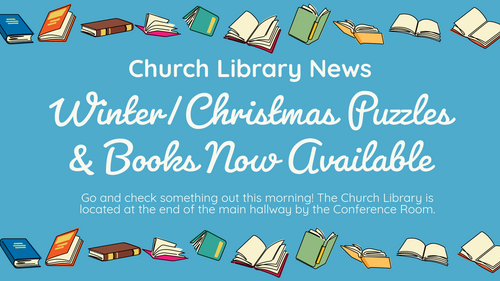 The church library has a wonderful selection of winter and Christmas books and puzzles! Stop by Sunday morning or during the week to check them out and borrow either a book or puzzle. The church library can be found at the end of the main hallway by the Conference Room.