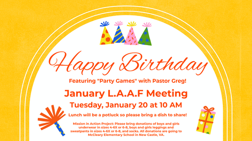 Those 50 and older are invited to this month’s Living Abundantly After Fifty gathering on Tuesday, January 20, starting at 10 AM. The entertainment for this month’s gathering will be a series of party games hosted by Pastor Greg. Lunch is potluck, so please bring a dish to share!