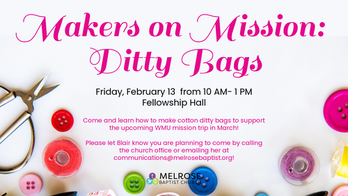 We are hosting a fun, informal sewing class on Friday, February 13 from 10 AM- 1 PM to learn how to make simple cotton ditty bags. These ditty bags are not only a great introduction project for the beginning sewer but are an important element for the local Women's Missionary Union's mission trip to Nickelsville, VA. They fill these handmade bags with personal hygiene items and distribute them to local school children.