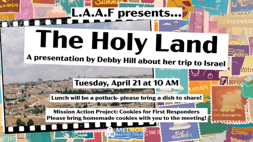 Those 50 and older are invited to this month's Living Abundantly After Fifty (LAAF) gathering on Tuesday, April 14 at 10 AM. The program for this month is a presentation by Debby Hill on her trip to the Holy Land. Lunch is a potluck so please bring a dish to share!