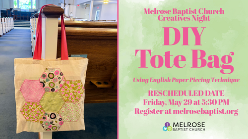 Due to Blair being sick, this month's Creatives Night is being rescheduled to Friday, May 29 at 5:30 PM in the Fellowship Hall. If you have already registered, your registration will automatically transfer to next month. The tote bag project for this month will become the project for May. This event is FREE, open to all, and all materials will be provided. We are requesting that those planning to attend please register on the church website here. This helps us properly plan enough supplies for everyone.